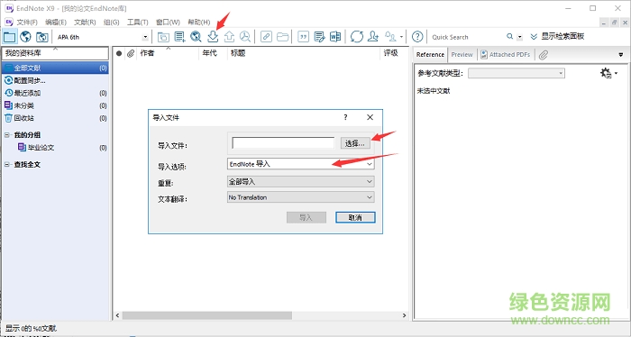 打开EndNote x9软件,找到刚刚创建的库,点击向下的箭头,在弹出的对话框中点击“选择”,找到要导入的文件,导入选项为“EndNote导入”,点击“导入”。
