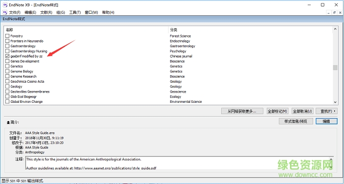在 EndNote 样式管理器中勾选geebinf modified by zz样式。如下图所示。