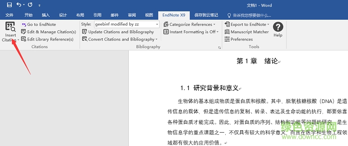 打开word,光标定位在需要插入参考文献的地方。打开EndNote x9选项,点击Insert Citation图标,如图所示。