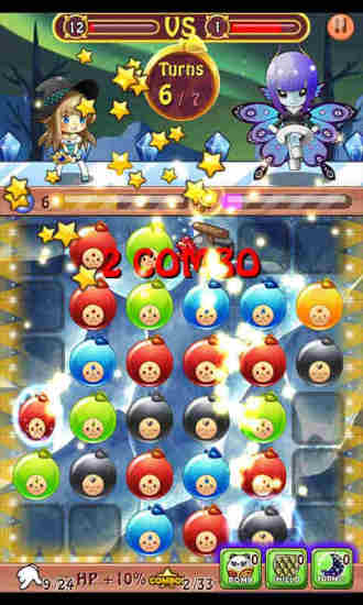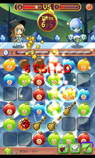 这一关的泡泡,是从上往下掉的,玩家要根据提示的颜色去消除掉下落的泡泡。下落的泡泡,可以用连线或点击的方式消除,顺带一提,连线连的多会有combo数加成哦,不过连线图中碰到其他颜色的泡泡将会中断连线,玩家需要重新连过,而且每错过一个当前提示颜色的泡泡,怪物就会回一部分血,打错泡泡时,怪物也会回一部分血。总的言之,这一类型也还是挺好上手,合理用连线组成高combo,造成高伤害,这就是下落型的玩法了。