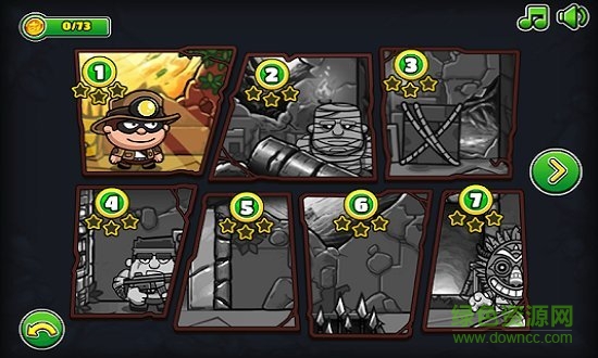非常有趣的玩法,点击屏幕让鲍勃前进,观察路线,从可以通过的门进入另一个房间,遇到一些机关要想办法通过,不同的机关通过的方法不同,遇到木乃伊要趁他不注意的时候将他打晕,有锁的门用万能钥匙打开,有摄像头的地方要注意躲避,遇到电梯要去其他的地方找密码,还有各种障碍等你来解锁,当然最重要的就是和搜集金币;