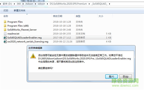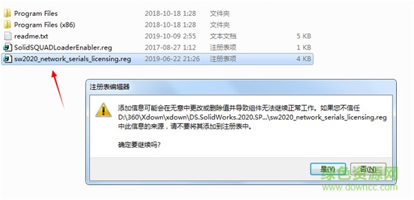 2.运行_SolidSQUAD_文件夹内的注册表文件 “ sw2020_network_serials_licensing.reg,点击是