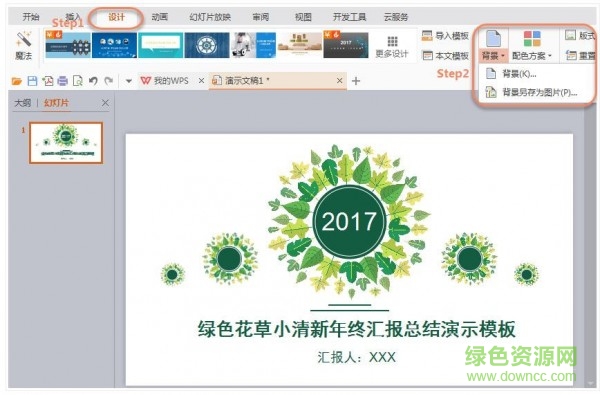 方法二:在功能区,点击“设计”-“背景”进行设置。