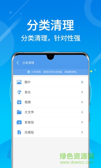 【分类清理】对图片、音乐、视频、大文件、安装包、压缩包进行单独清理,让用户更有选择性地进行垃圾清理,节省时间。