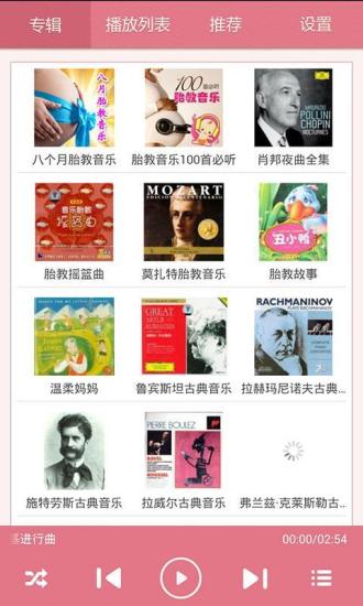 胎教音乐大全,是一款胎教音乐软件。提供了种类齐全的各式胎教音乐,柔美舒缓的音乐将是您孕期必备的好伴侣。常听胎教音乐可强化胎儿的听觉神经功能,促进胎儿脑部发育。胎教音乐所采用的缓慢节拍与孕妇在歇息时的心跳频率同步,因此非常适于孕妇放松,时常保持平和的心态,有利于胎儿的健康生长。此外,让胎儿较早的接触高雅音乐,更可以预先培养宝宝的艺术情操。