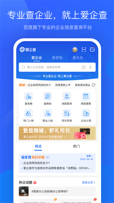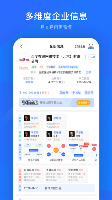 百度爱企查app免费版可以在线查询工商信息、企业信息。软件内置了海量最新的征信信息数据。无论是查询企业还是个人都可以快速搜索出相关信息。赶快来使用吧。