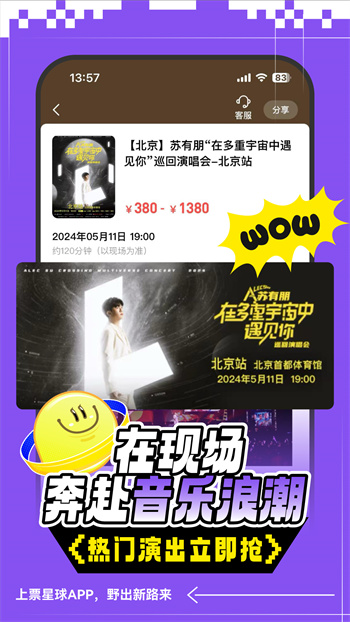 抢票流畅,一键分享快乐现场 抢票就来票星球,每个现场都有你