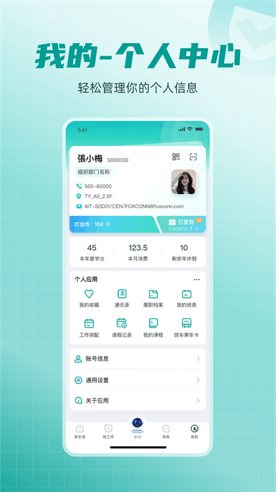 7.自助服务:可自行查询当天考勤、加班记录、请假记录、消费记录、年休假,还可关注人事异动信息、奖惩信息、合同查询、鞋柜查询、上岗查询、学分查询、旷工查询、体检信息、年资查询、号码百事通等