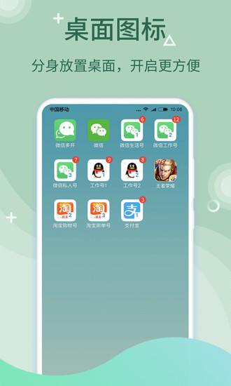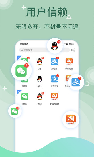 众多微信用户信赖的双开类APP,免费支持社交软件双开分身,如微信双开、QQ双开;娱乐、游戏应用双开分身,如全民k歌双开、王者荣耀双开;购物、出行等几乎所有APP的双开分身,解决用户多账户切换烦恼。