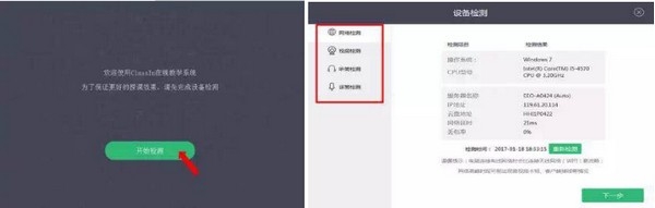 对于第一次安装使用ClassIn的用户,在登录教室前,ClassIn会帮助您对您的网络环境、以及音视频设备进行“体检”,以确保您能正常上课。