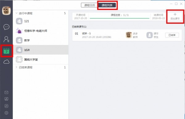 老师在【课程】中选择【课程列表】,可添加课节,方便快速开课。