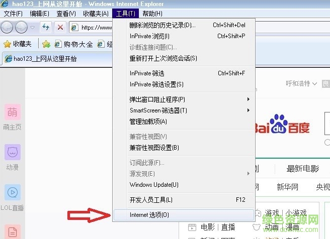 1,打开IE8浏览器,打开菜单“工具”下的“Internet 选项”。