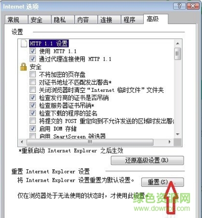 5,如果还不行,再打开“Internet 选项”,这回选择“高级”这一项,然后单击“重置”按钮。