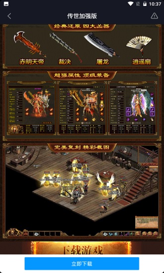 传世加强版游戏安卓最新版中装备道具非常之拉风,支持自由pk竞技,可以野外刷小怪领装备,非常恢弘大气的攻城场景,众英雄集结,战争一触即发,经典复古的传奇玩法,欢迎喜爱此游戏的朋友下载试玩!