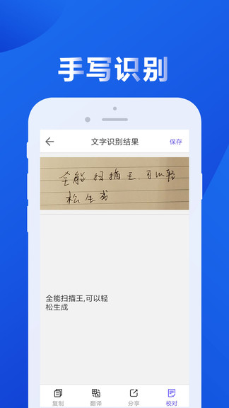 识别结果自动存为历史记录,文档保存无水印,查找方便;支持高质量的pdf、word和txt分享导出;支持文字翻译功能,一键翻译多种语言。