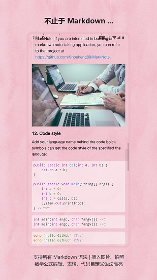 言叶是一个支持markdown的代码笔记编辑器,可以为你记录你正在学习的代码,还能在平时收集一些实用的代码进行记录。而且还可以自由设置主题,代码的格式也是自适应屏幕的,非常适合你在手机上也能完美浏览。而且还有多种文本格式可以支持,欢迎有需要的朋友下载使用!