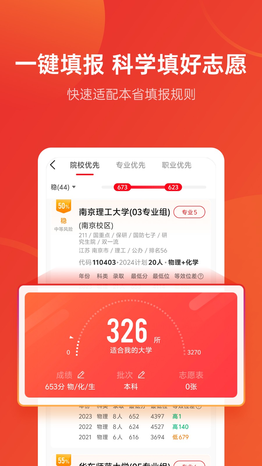 优志愿app官方版是专为高考学生精心打造的一款手机端高考志愿填报软件。通过本软件在线查询全国每所大学的录取分数线,在线进行模拟志愿填报!软件为用户提供了最新的高考填报资讯,可以根据省份选择查看感兴趣的大学招生信息,方便你及时掌握大学录取动态,还可以在线咨询志愿填报问题,助你轻松报考大学!