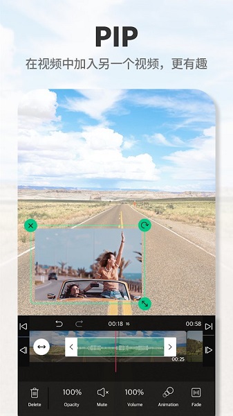 利用两根手指即可在屏幕上放大或缩小视频,还可以将视频的背景颜色改成想要的指定颜色或添加动画。可利用kenburns特效赋予静态影像沉浸感。