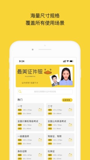 包含1寸、2寸、3寸、4寸等常规尺寸,同时提供百余种官方指定证照规格,如:毕业照、学位照、入学照等学生证照;会计、考研、计算机、公务员、医护、考研、幼师及语言类考试证照;还有社保、签证、简历、驾照等其他类满足您的各类拍摄场景需求。软件智能推出当下热门的证件照尺寸,让你更快捷高效的用手机制作证件照!