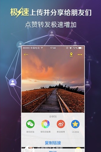 可以看到别人分享的全景照片并可以快速分享到微信好友、朋友圈、微博等社交网络。