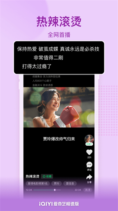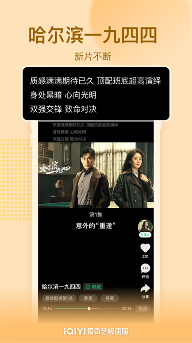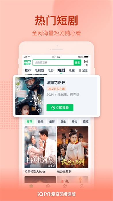 爱奇艺极速版app是款功能齐全的追剧软件,在爱奇艺极速版中,有着海量的影视资源,实时更新,更覆盖了全网热门短视频、新闻资讯等等,你可以享受极速的视频服务,包小可极速安装,省内存,不卡顿,速度快;还能流畅的视频浏览体验,界面简洁,体验流畅,搜索结果更清晰!