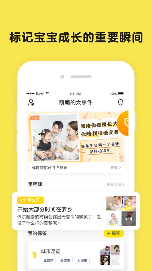 支持视频、照片、日记等形式轻松记录宝宝生活点滴,自动归集整理成时间轴。