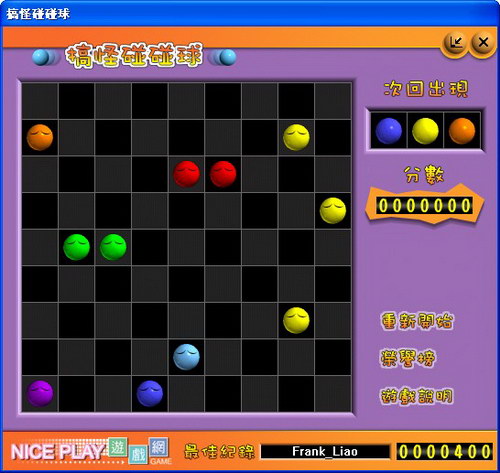 当画面上的空格都被小球塞满,而再也无法移动时,就算是游戏结束。一次消去5颗球可得10分,而每多消一颗球则加5分。游戏结束还有成绩排名,让玩家可检视自己的成绩是否有进步。