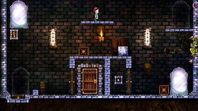2.第二关,先要利用跳跃功能来到下图的位置(按的越久,跳的越高),反转一次房间后让魔镜出现在女孩面前。之后站在魔镜旁再翻转一次房间即可让出口的通道出现在女孩所处的房间内。