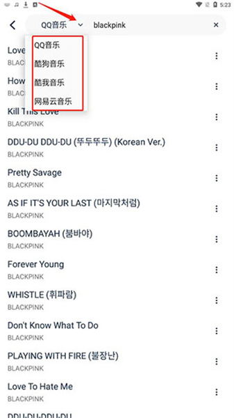 3、如下图所示,点击小箭头,即可在QQ音乐/酷狗音乐/酷我音乐/网易云音乐四大音乐平台进行切换搜索;