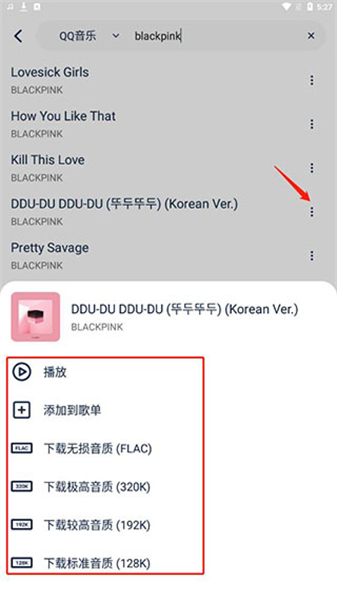 4、随后找到自己的目标音乐后,点击右侧的三个点图标,可以选择播放音乐,添加歌单,以及多种不同的音质下载选择。