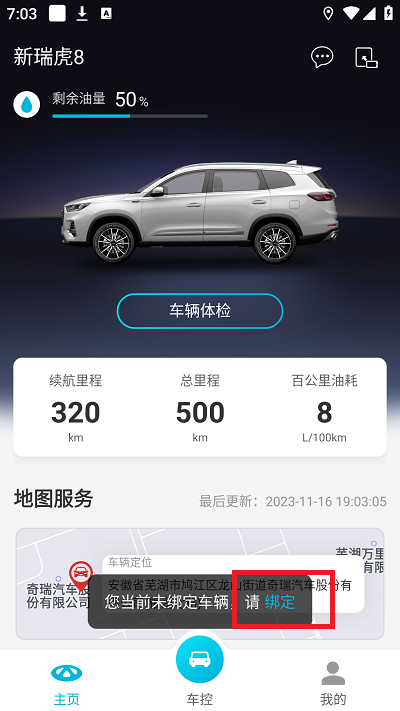 4、注册完信息之后,就会回到主界面,届时下方右下角还会显示你没有绑定车辆,这时需要点击【绑定】跳转到绑定车辆界面;