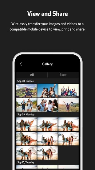 要查看和共享照片和视频,该应用程序可让您将它们无线传输到兼容的移动设备以进行打印、共享和编辑。