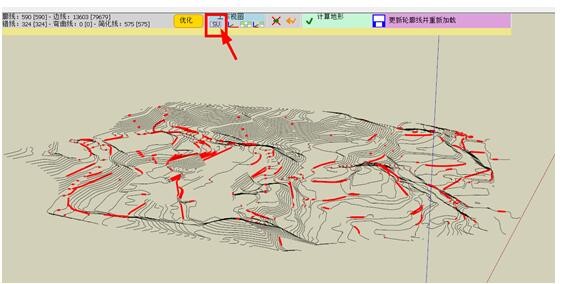 4、图中红的状态区均为断线之间的自动修复连接。插件作者fredo6设计toposhaper会在合理的范围内对所导入的等高线曲度和断点进行优化修复 在状态栏中也会有相关的提示。