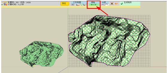 5、用顶视图模式显示 会看到虚线的网格覆盖整个山体 左侧为实体模型 右侧为放大视图的参考平面模式视图