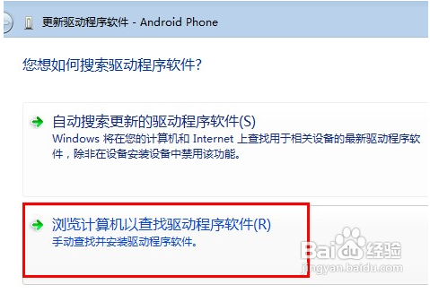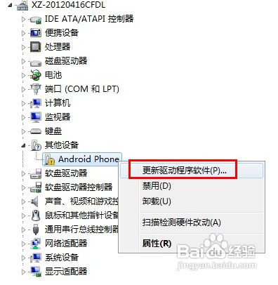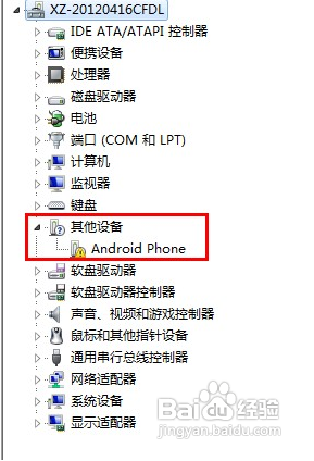 右键点击我的电脑,选择【管理】,然后点击左侧的【设备管理器】,(有的电脑可能点击我的电脑后就直接有设备管理器,直接选择设备管理器就可以了。)会看到有【Android Phone】一项上有感叹号,这个就是我们的手机设备。如下图