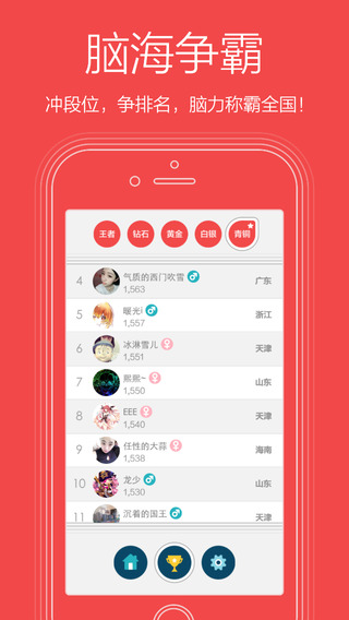 3.冲段位,争排名,脑力称霸全国:排名第一?看看您的段位吧!图样图森破!青铜、白银、黄金、砖石、王者,五大段位等您来挑战!