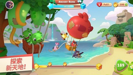 愤怒的小鸟新冒险是愤怒的小鸟全新推出的休闲弹射游戏,和愤怒的小鸟萌一起探索新的天地,不要让这座小岛被讨厌的绿猪们占领,帮助小岛上的生物迎回他们的家园,这一次有更多的关卡,更多的角色可以玩。