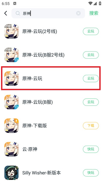 3、在搜索结果出来之后,我们点击【原神-云玩】,点击右边的【云玩】进行体验;