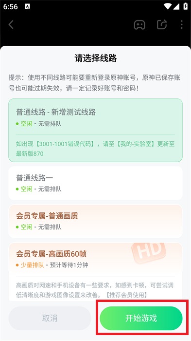 4、点击云玩之后,就会进入到选择路线的界面,在这里选择自己想要的路线,然后点击【开始游戏】开始体验。