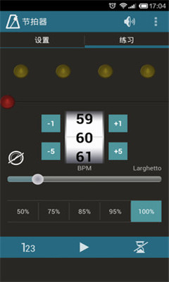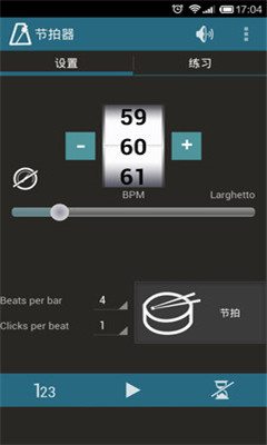 节拍器app是一款非常好用的专业节拍器手机应用软件。这款app可以通过手机上的一些设置将你的手机变成一个节拍器,喜欢的朋友可以自己设计想要的节拍并在你的手机上练习,功能非常强大,需要的朋友赶紧下载体验吧。在细分设置屏幕上你可以随便设置你想要的节拍。当您启动节拍器切换到练习的屏幕画面,其有用的节拍指标。在练习模式中,你可以方便地增加和减少的速度在较小的增量,这样你就可以开始缓慢,并建立一个触摸屏幕的速度。采用了新的平板布局,所有这些功能都可以达到一个方便的屏幕。如果你在寻找最专业的节拍器,那么我们的节拍器将是你最佳的选择。