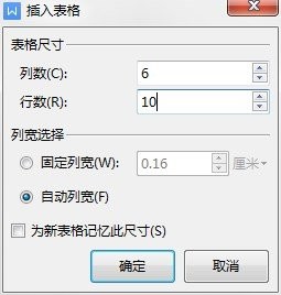 2、在“插入表格”设置框的“列数”选择6,“行数”选择10。点击下方“确定按钮就会出现一个6列10行表格。