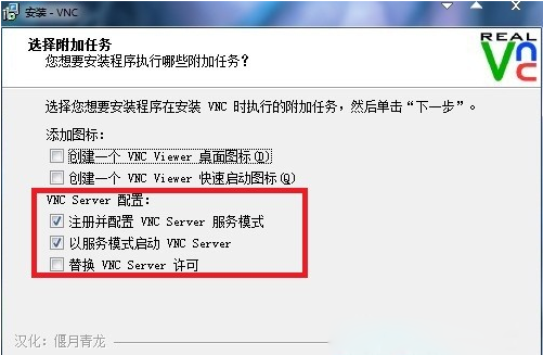 双击“vnc-E4_2_9-x86_win32_CHS.exe”进行安装,同样一直下一步,直到下图两项需要勾选