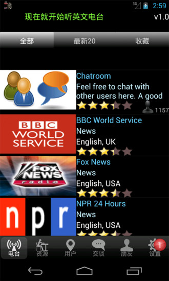 英语电台雅思托福听力口语是一款可以收听全世界各地英文电台的应用,非常适合用来练习雅思,托福,托业,英语四六级等听力。边听广播边学英语,一举两得,寓教于乐。软件汇集了全世界各地的用户,国内用户可以与来自各国的网友对话聊天,快速提高口语能力。