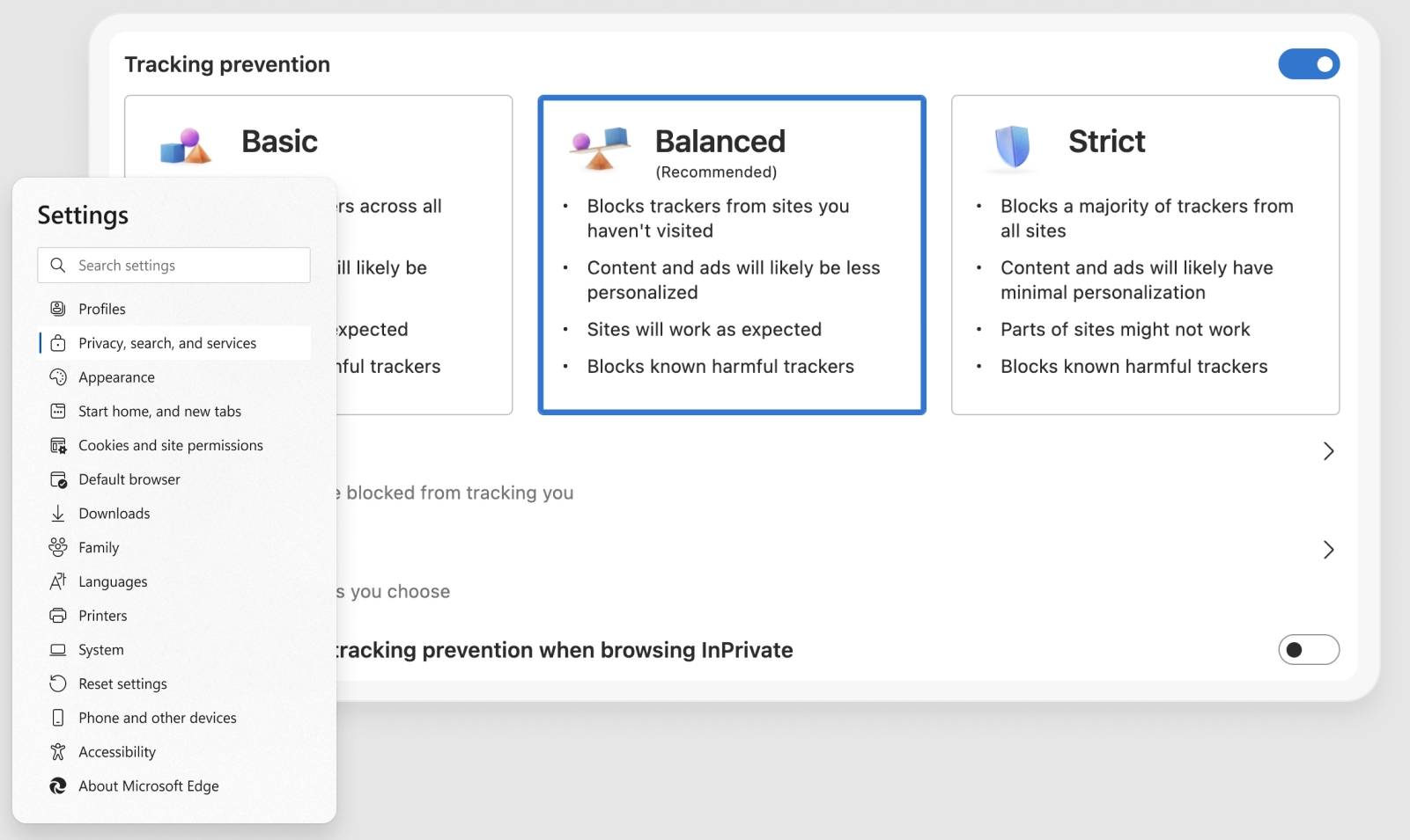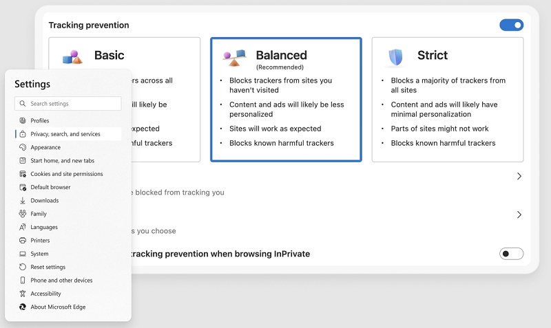 包含内置的跟踪防护功能,可避免您的浏览活动受到在线跟踪系统的跟踪。可在Edge设置中轻松选择跟踪防护级别。