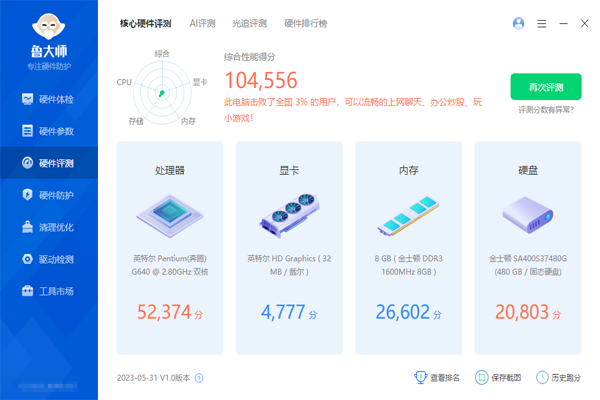 鲁大师可以对电脑硬件进行检测,从而进行评分,帮助用户了解电脑硬件的综合性能评分。