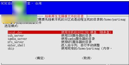 挂载再生龙镜像文件的目录,选择模式"local_dev使用本机的分区(如:硬盘,随身盘)"。注意:如果要将备份的镜像存储到再生龙工具U盘或是准备恢复的镜像存储在再生龙工具U盘中,请选择"Skip 使用现有的/home/partimage(可写装置如硬盘/随身盘)"。