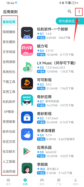 2、点击应用栏目,给大家根据不同的软件类型进行了细致划分,用户可以根据分类快速找到需要的软件,同时也可以单机右上角的三个点标志;