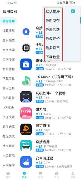3、点击三个点标志则会出现不同的排序,有最新发布/最近活跃/最多评价/最多投币/下载数量不同的排序;