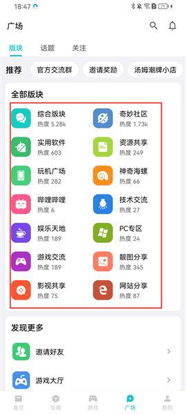 5、点击广场栏目,则有丰富的不同的广场板块,地喜爱同时现实热度量,用户可以选择自己感兴趣的话题与网友进行讨论。