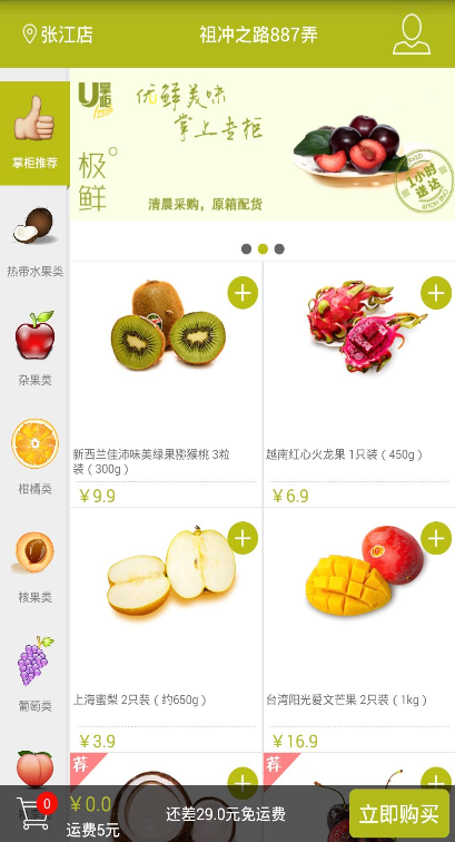 u掌柜app是一款水果配送类手机软件,精选新鲜优质水果,种类丰富,自产自销,清晨采购保证水果鲜度,用户只需选择自己喜爱的水果下单后,足不出户就能在1小时内享受新鲜水果,喜爱的朋友赶快下载体验吧!